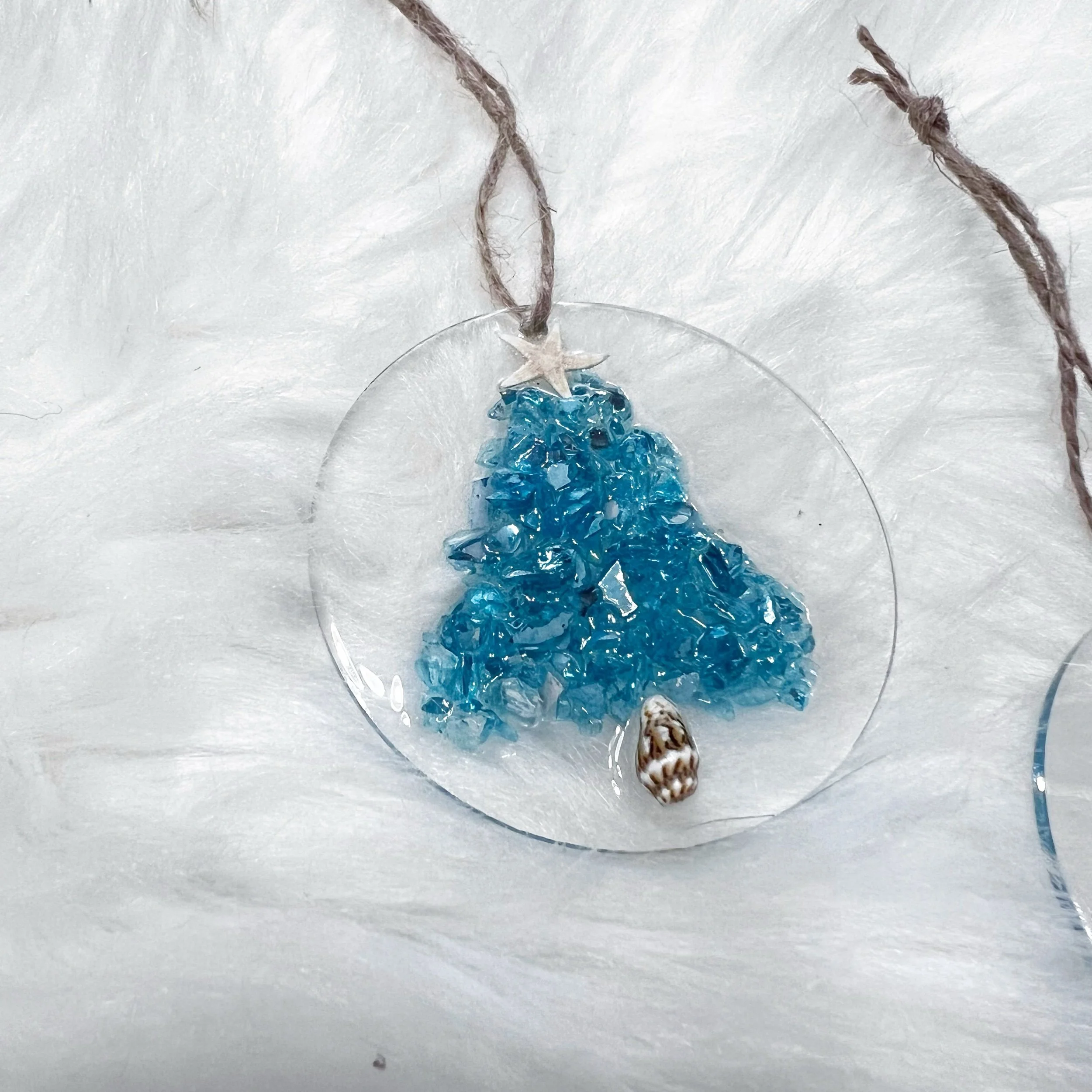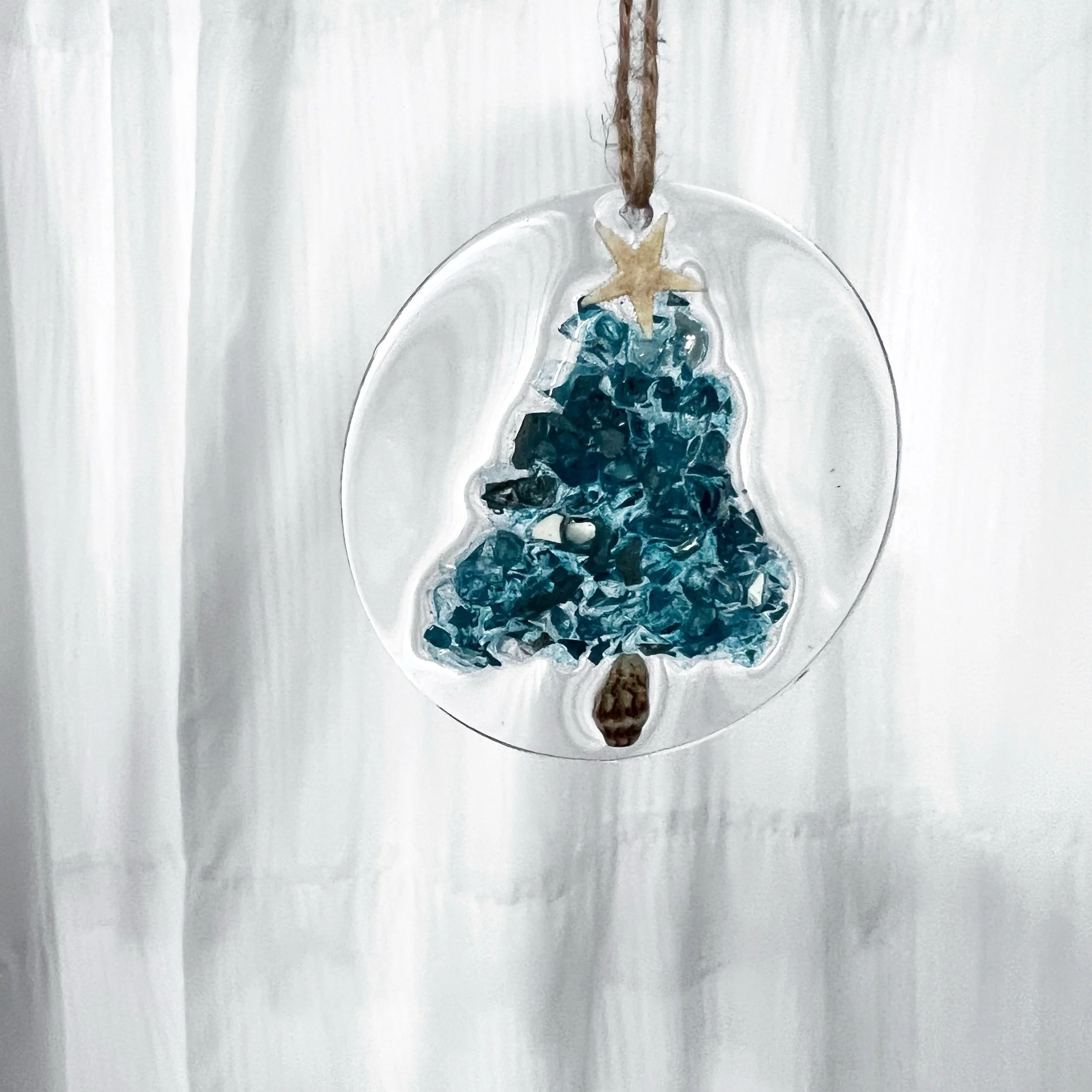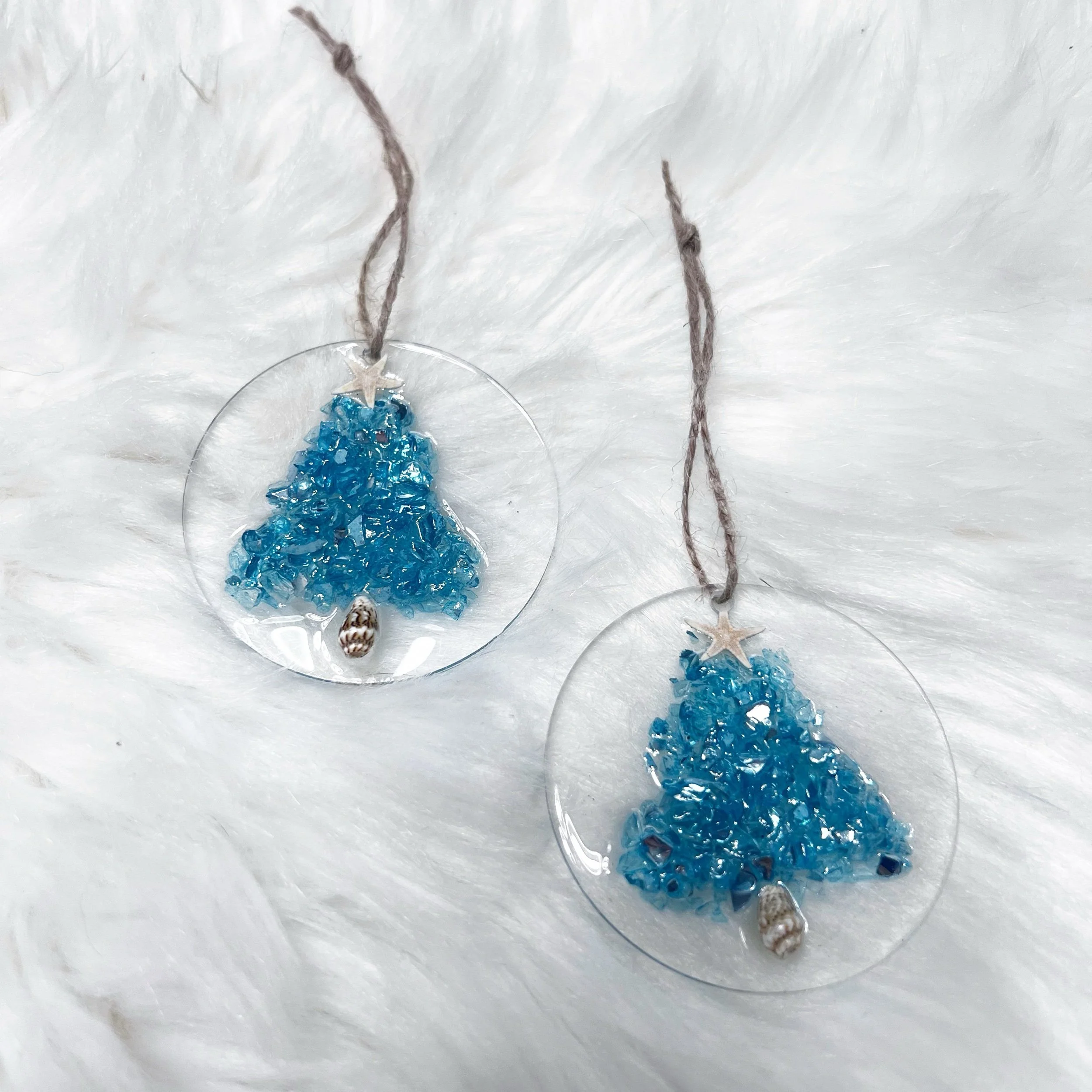 Bring home a little piece of the ocean today with one of these adorable Christmas Tree ornaments. Each ornament comes with a layer of resin featuring a crushed glass Christmas Tree with a genuine starfish as the star and a tiny shell as the tree’s trunk. Ornaments are 2” in diameter. Perfect for the beach lover in your life!