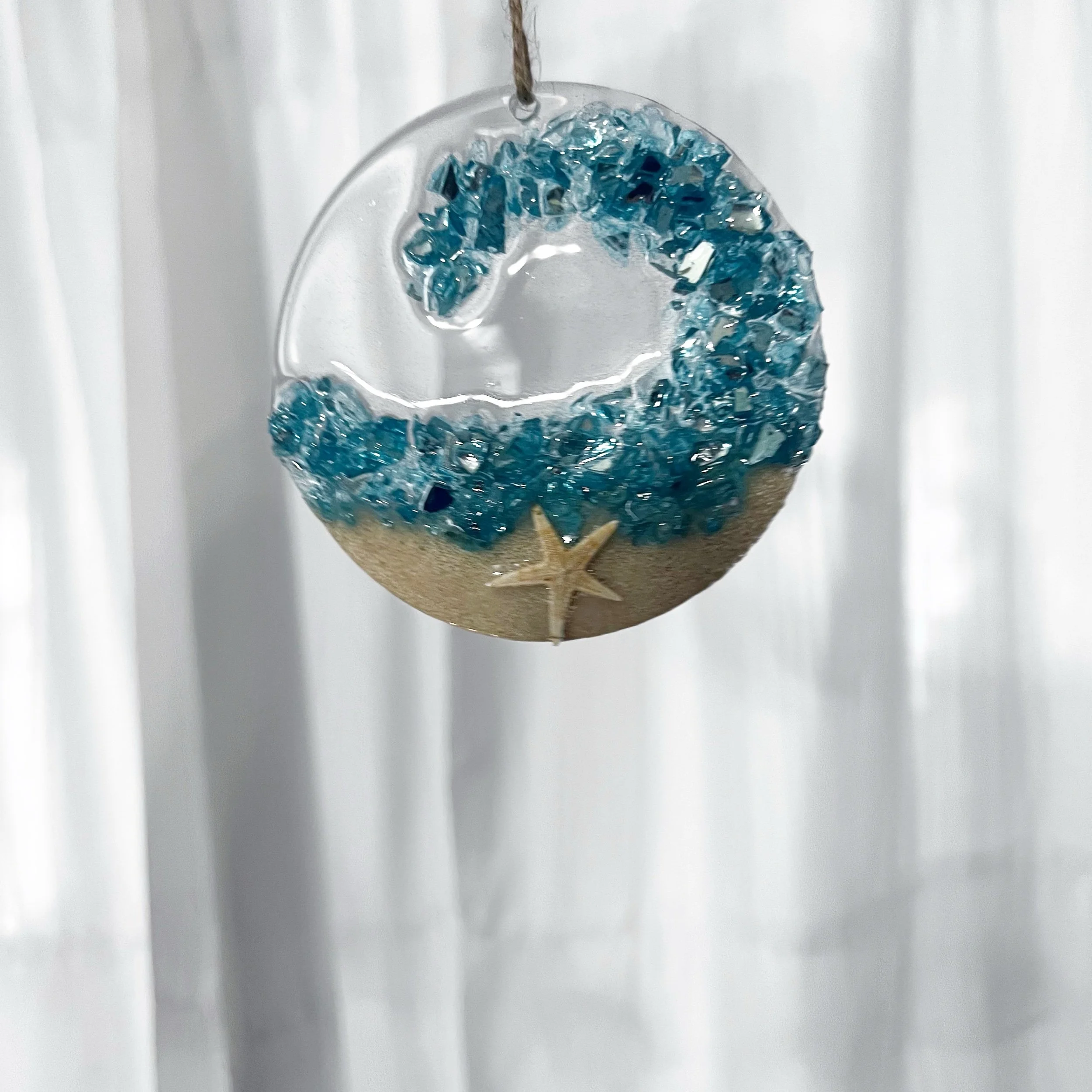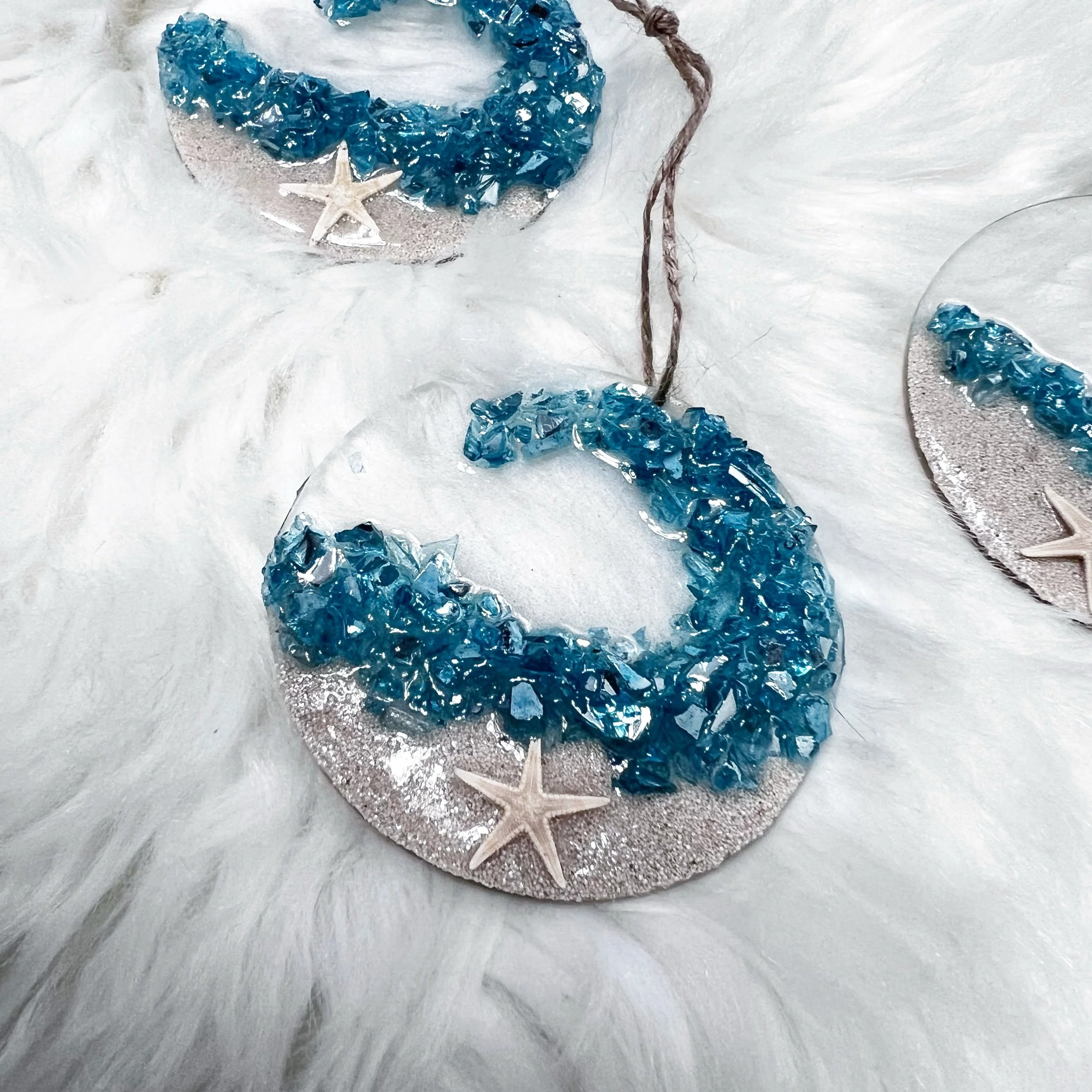 Bring home a little piece of the ocean today with one of these adorable starfish wave ornaments. Each ornament comes with a layer of resin featuring a crushed glass wave washing ashore a beach comprised of sand from the Bahamas with a genuine starfish. Ornaments are 3” in diameter. Perfect for the beach lover in your life!